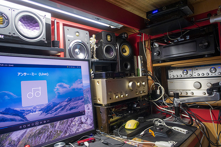 サラウンドプロセッサとオーディオファイルのDACとして、15.5chのAVプリアンプを使っています。YAMAHAのCX-A5000からMarantzのAV8801に、そしてMarantz AV8805切り替えました。 (Marantzへの切り替えでスピーカのセッティングをYAMAHA型からMarantz型へ変更しました) AV8805はDolby AtmosやAura3Dに対応しているので、スピーカ、アンプを追加。 当初PC内蔵のSound BlasterのX-Fi Xtreme Audio(7.1chのサラウンドに加えS/N100dBのローノイズが特徴)を使っていましたが、その後 ASUSのSTRIX RAID DLX(7.1ch S/N 124dB)に入れ替えました。これは外付けでボリュームコントロールとスピーカ/ヘッドフォン切り替えが出来便利でしたが、Dolby DigitalやDTS等の業界標準のサラウンド再生機能が付いていなかったので、それらのサラウンド機能とネットワーク経由でのDigital音源の再生機能を備えてた11.5chのAVアンプを追加しています。 サラウンドシステム ◇フロントは ELAC BS312 と B&W PM1 を並べて駆動しています。 パラレルに並べることで音の厚みと言うか深みが増した気がします。 当初はBS312とPM1を切り替えて聴いていましたが、それぞれの特徴を同時に味わいたい思い から、並行駆動することにしました。はじめはアンプの出力をアッテネータで音圧を合わせてセ ッティングしましたが音質が低下したのでアンプ(SANSUI AU-α607MR)を追加してパラ接続 にして聴く様にしました。 BS312はSANSUI AU-α607MRで、B&W PM1はSANSUI AU-α907KXでドライブしてます。 ELAC BS312は非常にコンパクトな筐体からは想像できない様なスケール感を伴った音を 提供してくれます。小型でありながら引き締まった低音、どこまでも澄み切った中高音がとても 魅力的。 B&W PM1はB&Wの45周年を記念して製作された限定モデルです。 ノーチラスチューブのツィータが特徴、低域から高域まで繊細でクリヤな音です。前述のBS812 と互角と思います。 ◇センターは、DALIのOBERON VOKALとDALI MENTER MENUETを切り替えられる様に していましたが、ELACの音域の広さと調和させたくて、ELACのcc241.BEに入れ替えました。 アンプは高音のキレが評判のSANSUIのAU-α907L EXTRAです。 厚みのある重厚で力強くズンズンと体に響く低域と抜ける様な高域、歪みの無い綺麗な中域の 音です。 ◇フロントワイドは、DALI MENTER MENUET をSANSUI B2102 MOS VINTAGEでドライブ (オーディオを始めた頃 このMENUETをフロントのメインスピーカにしていました。) ◇サラウンドはDENON SC-M39から 3WayのKEF R300 に変更、 ドライバーはRotel RB-1582 このKEF R300も広い音域をカバーする高性能なブックシェルフスピーカです。 フロントに設置したかったが、筐体が大きく棚に入らなかった為、サラウンドバックに配置 しています。 ◇サラウンドバックは DENON SC-CX101 とONKYO A-905Xの組み合わせ ◇フロントハイは ONKYO D-22XMをとONKYO A-905FXの組み合わせ ◇サラウンドバックハイトにSony SR015を配置して、SansuiのA-α7で駆動。 このA-α7も良い音を出します。 ◇サラウンドハイトに YAMAHA NS10MMをONKYO A-905X ◇サブウーハ ONKYO SL-057を使っていましたが、ウーハはバスレフ方式よりも密閉方式の 方が良いとの話があったので、 FOSTEXのCW250A(25cmの密閉型)とVicterのSX-DW77(30cmの密閉型) を追加し ダブルウーハとしました。低音域の厚みが増した感じですね。 オーディオは車と同じで金を掛ければキリが無い、でも典型的な自己満足の世界なので楽しむ自分が満足、納得出来れば、それで良いのではないでしょうか。 プリアンプにAV8805を加えてから音の質が格段にアップ、現状は大変満足。 お気に入りのサラウンドデコードロジック ・YAMAHA CX-A5000のケース 最近(2021/10/30)サラウンドの設定を色々幾種類か試していて、その中で Dolby ProLogic Ux(7.1ch)のmusicの設定が、音の広がりと言うか、深みと言うか、それとも 厚みと言うか とても気に入りました。 ドラマやmovieもこの設定を使っています。 ・Marantz AV8805 最新更新:音楽でも映画でも、Dolby系一本槍 音が素直な響きで わたし好み AV8805のEQなどはOFFで、わたし好み
