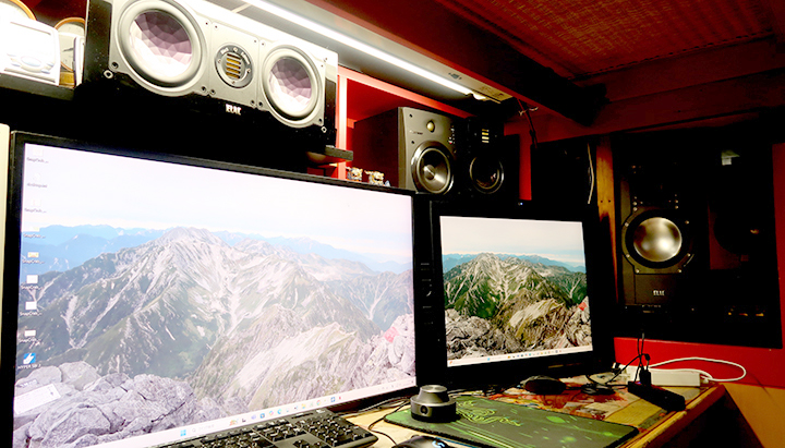 | くつろぎのひとときにJAZZを、特に気に入っているのがピアノジャズ、 自宅はマンション一室です。大きなスピーカではお隣さんにご迷惑が掛かるので小音量でも本格的なオーディオルーム並の臨場感を味合うには、小型スピーカでニアフィールド・サラウンド環境で聴くのがお勧め、(最初にソニーのサラウンドヘッドフォン(MDR-HW700)を試しましたが、小型でもスピーカで聴く方が心地良いと思います。) PC用のアクティブスピーカから始まり試行錯誤の末に、現在は13.5chサラウンドのニアフィールドオーディオとなっています。つまり1m〜1.5mのニアフィールドエリアに15台+1台で合計16台のスピーカを配置しています。(同時に駆動可能な数は13.5ch) 少し大きなPC机の本棚を占拠して何とか収まっていると言う感じかな〜。 |