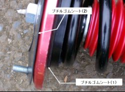 このゴムマウントとアッパーマウントの間にさらにゴムシートを挟みこみスプリングとゴムマウントを介しての振動と音の遮音性を高めることにしました。 数百kgの車重を支え、夏の暑さ、冬の寒さ、雨に負けない耐環境性と耐振動吸収性が必要なことからブチルゴムのシートを使うことにしました。 ちなみにブチルゴム(IIR:イソブチレン・イソプレン共重合体)は耐オゾン性、耐老化性、電気絶縁、性耐候性、衝撃吸収性が良いのが特性です。東急ハンズで2mm厚のブチルゴムシートを買い、カットして使いました。 |