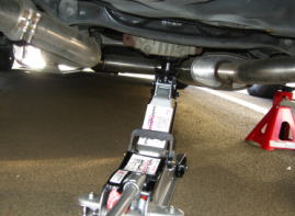 A作業開始(リア側から開始) 1)ジャッキアップする前にタイヤホイールのボルトを緩めます。 2)油圧式フロアジャッキの作業空間を確保する為に、まずねじジャッキで車体の片側をジャッキアップ。リアメンバーのデフギアにフロアジャッキをセットし、車体をジャッキアップ、次に馬をセットし、ゆっくり油圧を抜いて馬に乗せます。 馬は作業中の安全を確保する為には必需品です。ジャッキに乗せた状態での作業は、とても危険です。 3)タイヤホイールの取り外しに掛かります。 |