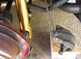 4)スタビライザーリンクのロアアーム側のボルトを揺る、リングを外し、ブレーキキャリバーも取り外します。 (リア側は、ブレーキキャリバーを取り外さないとアブソーバと干渉し、アブソーバが取り外せません)写真の様に台を用意し、乗せておくか、針金の様なもので、吊って、ブレーキパイブに余計なストレスが掛かるのを防ぎましょう。 5)リアトランクを開けてアブソーバのボディへの取り付けナット3個を緩め取り外しますが、アブソーバには縮み方向へのテンションが掛かっていてアブソーバ本体は取り外せません。アブソーバのロアアームへの取り付けボルトを緩め、ナットを取り外しておきます。 |
