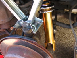 7)6)の状態で交換する車高調(ADVOX)を組み入れ、ジャッキを縮めながらロアアームとボルトで固定、さらにボディ側のボルト穴の位置を確認しながらジャッキを縮めてゆき、装着。 | ![]() |